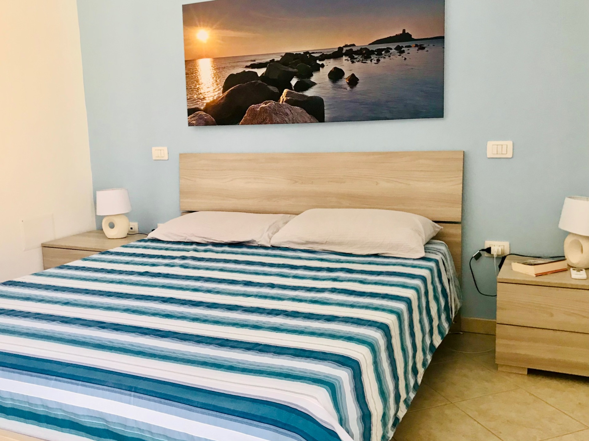La CAMERA MATRIMONIALE spaziosa e luminosa, potrà cullare il vostro sonno. Ad accogliervi, una foto su tela dell’alba di Pula, precisamente la foto è stata scattata dagli scogli che ci sono sulla spiaggia di Is Figus.